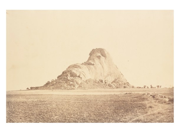 “An enormous mass of granite or sienite situated to the north of the town of Madura, altogether isolated from the neighbouring Hills, and when viewed from the S. E. or S. W. bearing a strong resemblance to a couchant Elephant, with its trunk extended in front. The origin of the rock according to Hindu legends is as follows. In the reign of Vikrama Pandyan the (Soran) king of Kanchipuram (called by the English Conjeveram) invaded Madura at the head of 8000 Bauddhas or Samanal, bringing with him an enormous Elephant, which had risen supernaturally from the flames of a huge sacrificial pit dug by the King. This Elephant was however destroyed by Shiva, whose aid was invoked by the Pandyan King with a rocket called Narashimha Astram; and the carcase, transformed to a mountain, remains to this day.”
