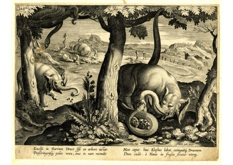 When it is met unexpectedly, the dragon raises itself up, faces its opponent, and flies more especially at the eyes; this is the reason why elephants are so often found blind, and worn to a skeleton with hunger and misery. What other cause can one assign for such mighty strifes as these, except that Nature is desirous, as it were, to make an exhibition for herself, in pitting such opponents against each other?”