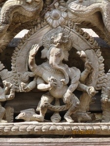 To say that Ganesh is ubiquitous and beloved in Nepal is understatement, way under. The living presence of gods and goddesses is taken for granted, made visible everywhere there is a pillar, shrine, doorway, gate, niche in a tree, hump of native rock protruding the brick pavement. They are offered incense, anointed with red pigment, sprinkled with orange and yellow petals, smeared with fat, sung to, fed, clothed, washed, stepped over, circumambulated, worn featureless by countless loving hands. On cards, posters and decals, carved in wood, cast in bronze or plastic, suggested in stone, cutesy stuffed toys, fierce and friendly, the images are simultaneously divine and symbols of divinity.
